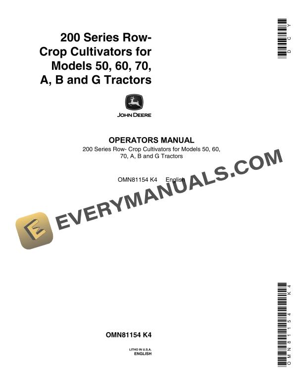 John Deere 200 Series Row- Crop CULTIVATOR Operator Manual OMN81154