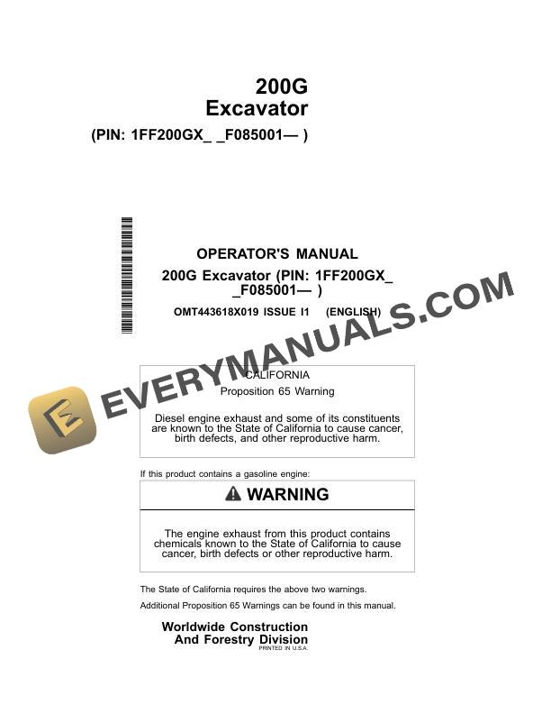 John Deere 200G Excavator Operator Manual OMT443618X019 by manualgroup - Issuu