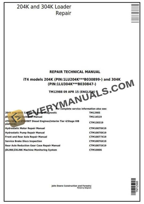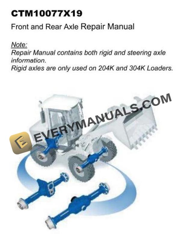 Format: ZIP, included set of PDF Manuals (TM12988.pdf, Loader Repair Manual, 242 Pages; CTM10075X19, Rear Axle Reduction Gear Case Repair Manual, 13 Pages; CTM10076X19, Service Brake Discs Inspection, 8 Pages; CTM10077X10, Front and Rear Axle Repair Manual, 65 Pages; CTM10078X19, Hydrostatic Pump Repair Manual, 62 Pages; CTM10079X19, Hydrostatic Motor Repair Manual, 52 Pages)
