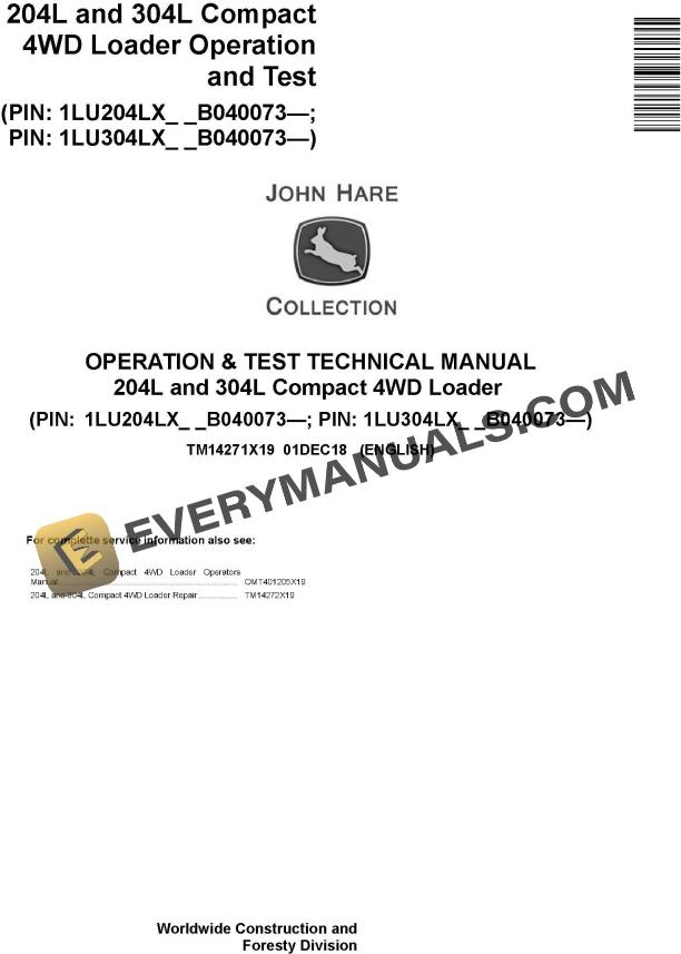 John Deere 204L 304L Compact 4WD Loader Operation Test Technical Manual TM14271X19