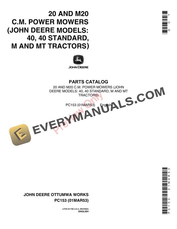John Deere 20, M20 Center-Mounted Power Mowers Parts Catalog PC153 01MAR53