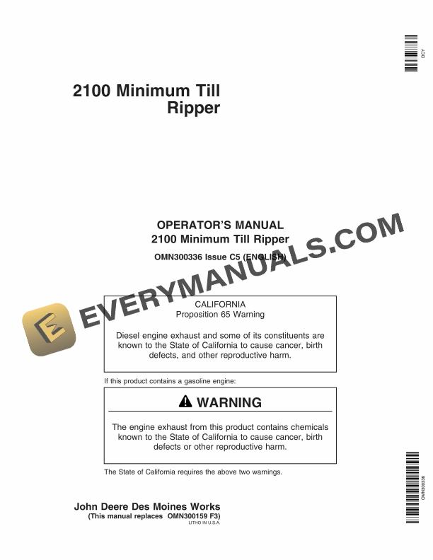 John Deere 2100 Minimum Till Ripper Operator Manual OMN300336
