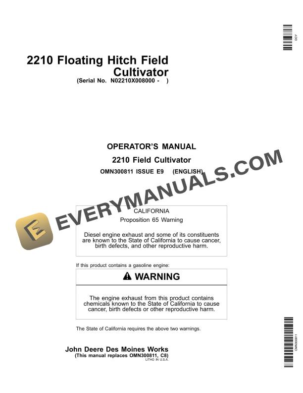 John Deere 2210 Floating Hitch Field Cultivator Operator Manual OMN300811