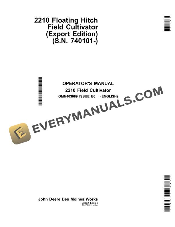 John Deere 2210 Floating Hitch Field Cultivator Operator Manual OMN403089