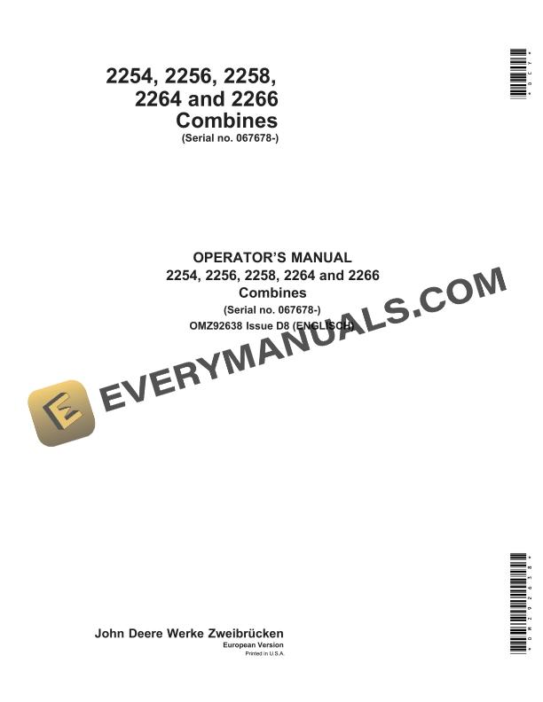 John Deere 2254, 2256, 2258, 2264 and 2266 Combine Operator Manual OMZ92638