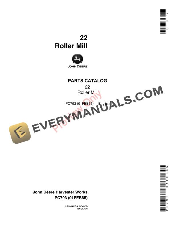John Deere 22 Roller Mill Parts Catalog PC793 01FEB65