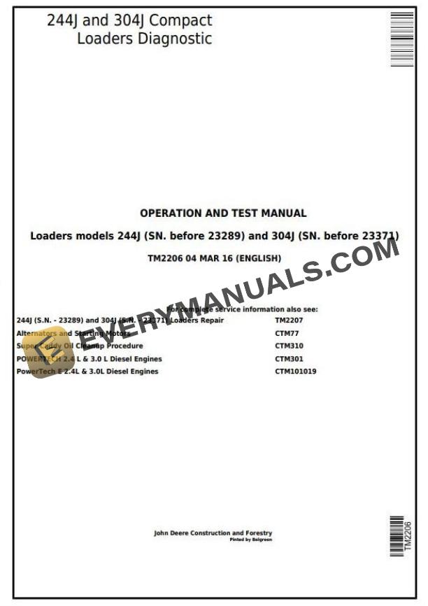 John Deere 244J 304J Compact Loader Diagnostic Operation Test Manual TM2206