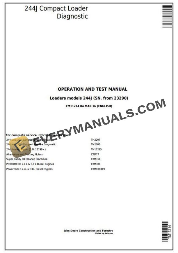 John Deere 244J Compact Loader Diagnostic Operation Test Manual TM11214