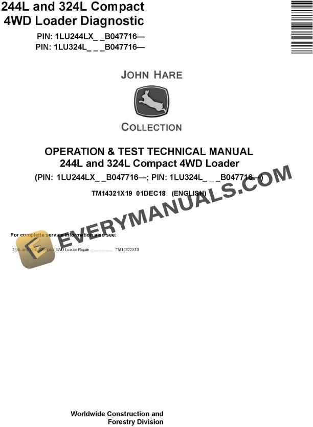 John Deere 244L 324L Compact 4WD Loader Operation Test Technical Manual TM14321X19