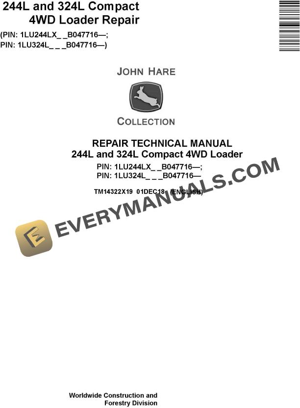 John Deere 244L 324L Compact 4WD Loader Repair Technical Manual TM14322X19