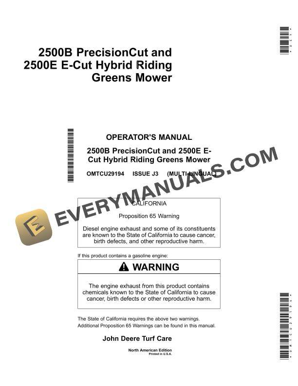 John Deere 2500B PrecisionCut and 2500E E Cut Hybrid Riding Greens Mower Operator Manual OMTCU29194