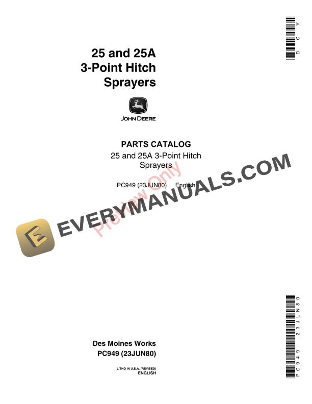 John Deere 25, 25A 3-Point Hitch Sprayers Parts Catalog PC949 23JUN80