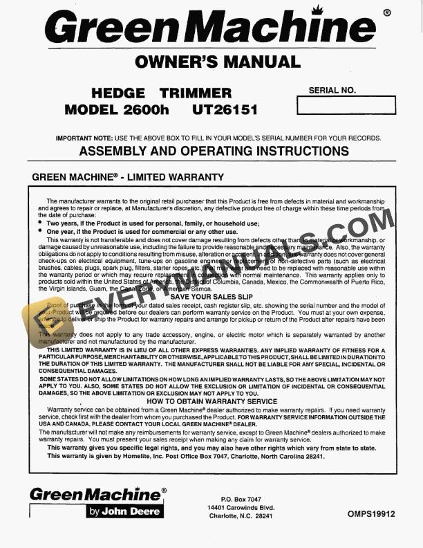John Deere 2600h UT26151 HEDGE TRIMMER Operator Manual OMPS19912