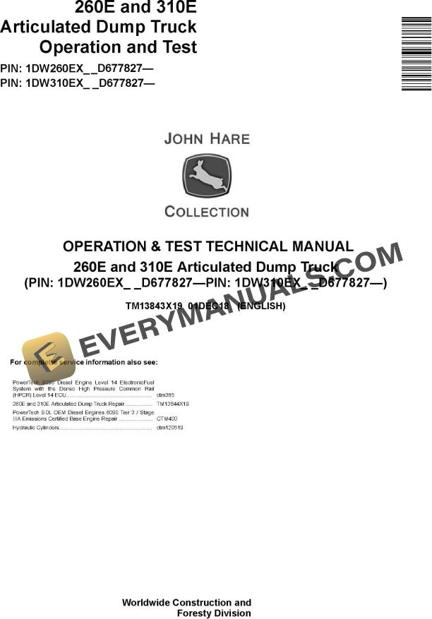 John Deere 260E 310E Articulated Dump Truck Operation Test Technical Manual TM13843X19