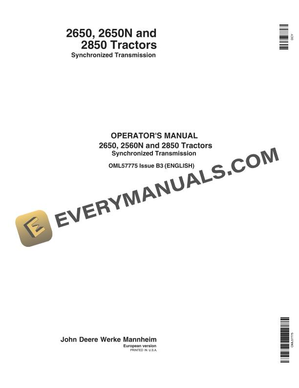 John Deere 2650, 2560n And 2850 Tractors Operator Manuals OML57775