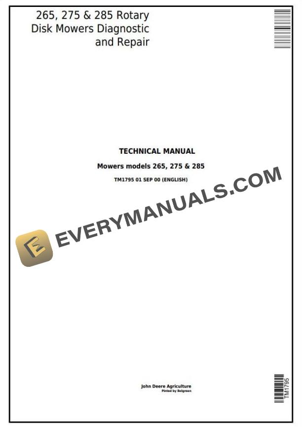 John Deere 265 275 285 Rotary Disk Mower Diagnostic Repair Technical Manual TM1795 PDF