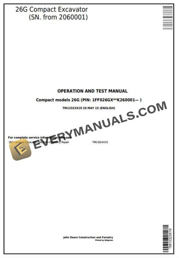 John Deere 26G Compact Excavator Operation Test Manual TM13323X19