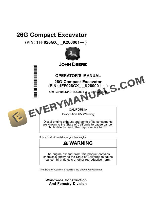 John Deere 26G Compact Excavator Operator Manual OMT361084X19