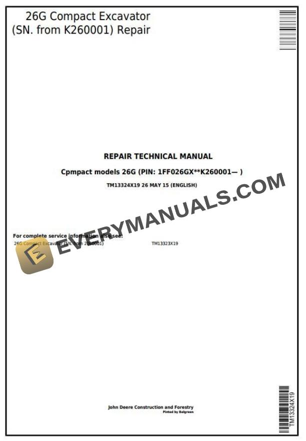 John Deere 26G Compact Excavator Repair Technical Manual TM13324X19 PDF
