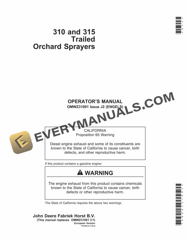 John Deere 310 and 315 Trailed Orchard Sprayer Operator Manual OMWZ31001