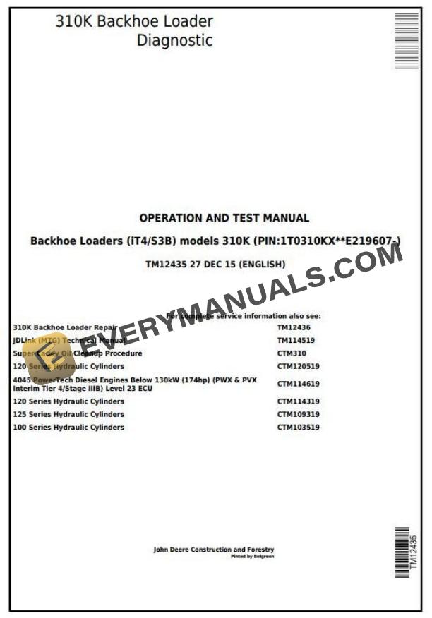 John Deere 310K Backhoe Loader Diagnostic Operation Test Manual TM12435