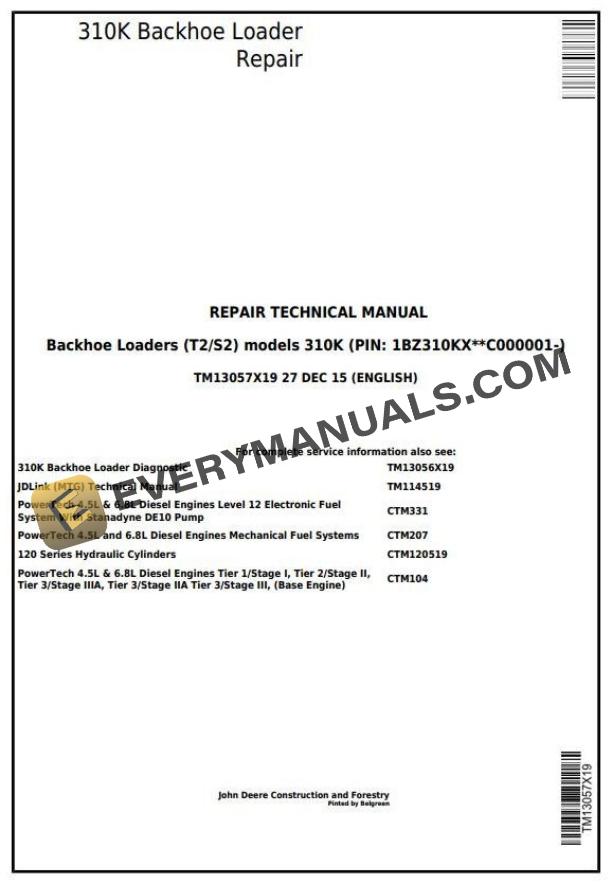 John Deere 310K Backhoe Loader Repair Technical Manual TM13057X19