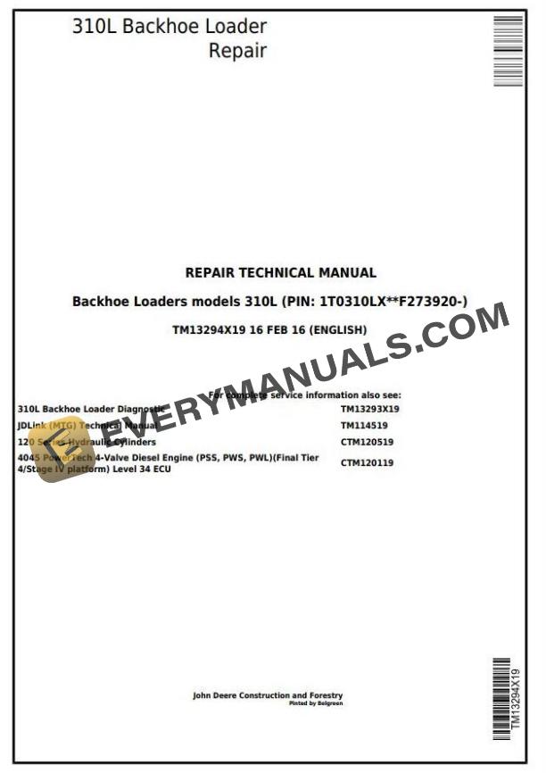 John Deere 310L Backhoe Loader Repair Technical Manual TM13294X19
