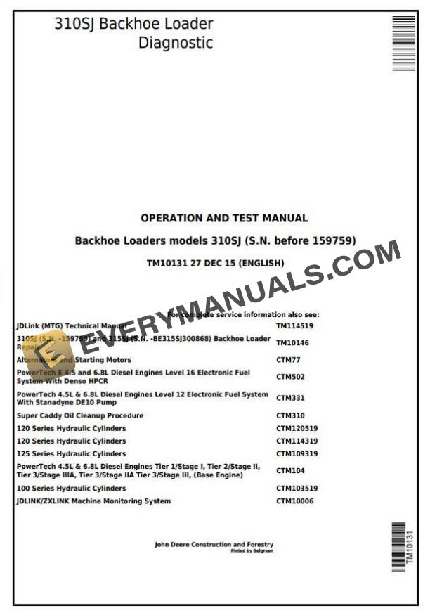 John Deere 310SJ Backhoe Loader Diagnostic Operation Test Manual TM10131
