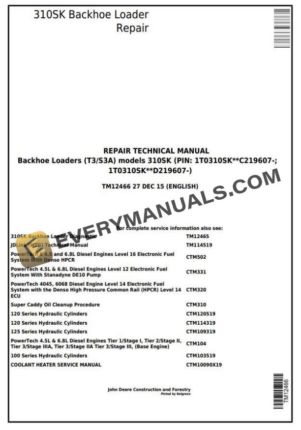 John Deere 310SK Backhoe Loader Repair Technical Manual TM12466