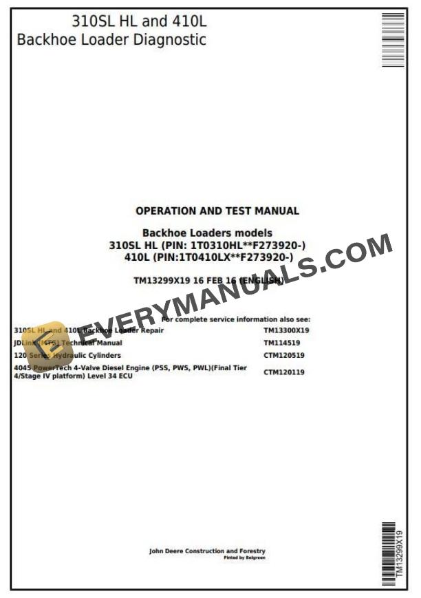 John Deere 310SL HL 410L Backhoe Loader Diagnostic Operation Test Manual TM13299X19