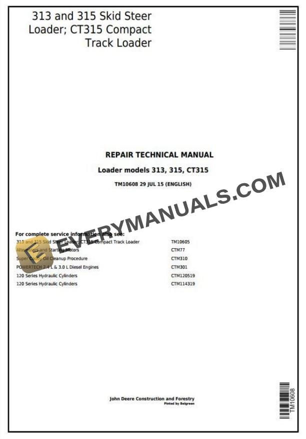 John Deere 313 315 CT315 Skid Steer Compact Track Loader Repair Technical Manual TM10608