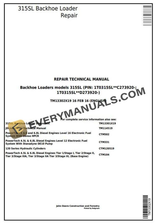 John Deere 315SL Backhoe Loader Repair Technical Manual TM13302X19