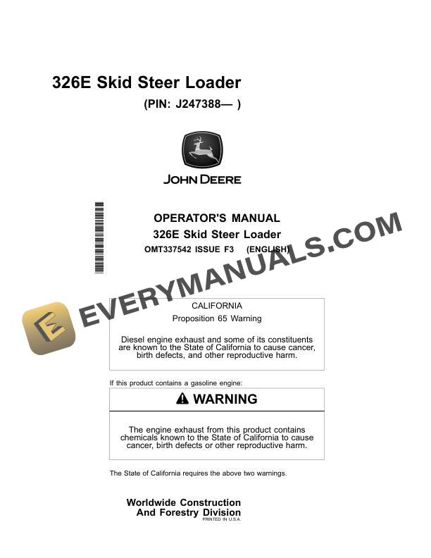 John Deere 326E Skid Steer Loader Operator Manual OMT337542