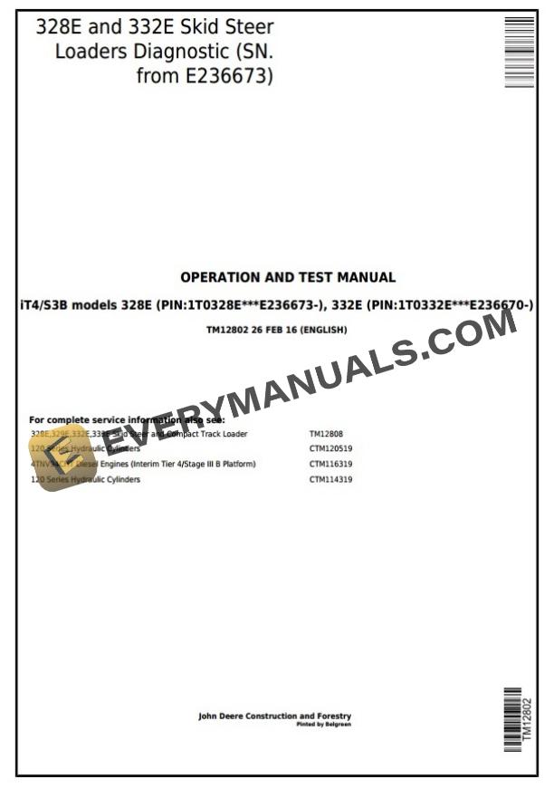 John Deere 328E 332E Skid Steer Loader Diagnostic Operation Test Manual TM12802