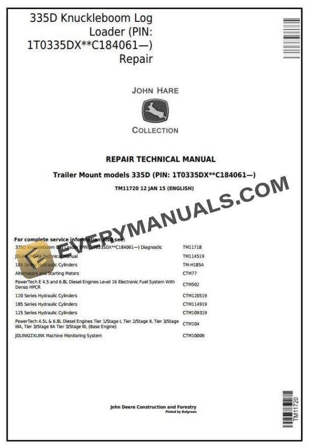 John Deere 335D Knuckleboom Trailer Mount Log Loader Repair Technical Manual TM11720