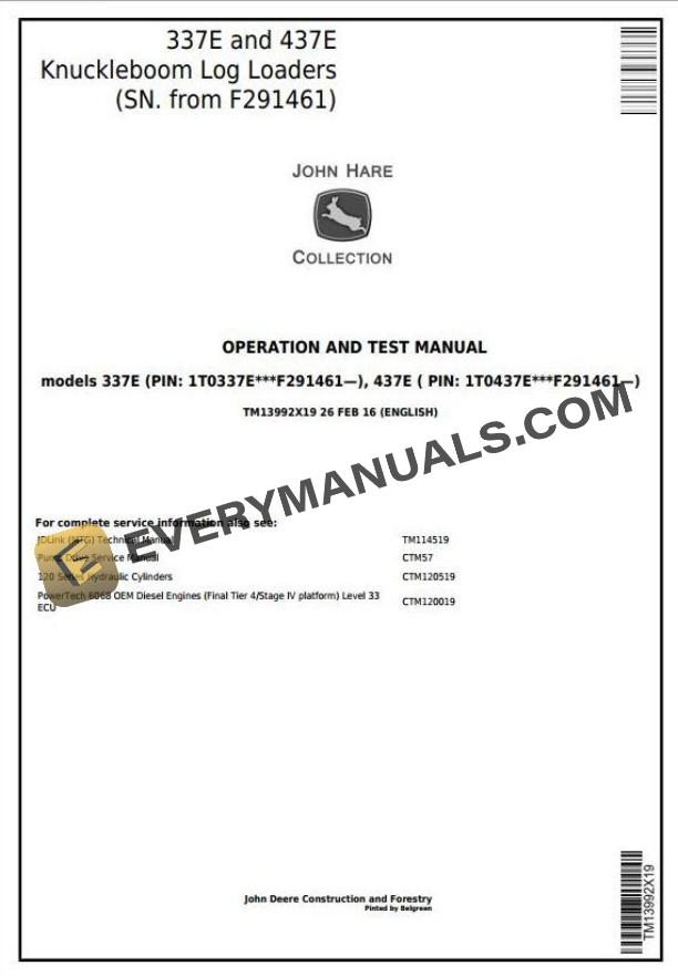 John Deere 337E 437E Knuckleboom Log Loader Operation Test Manual TM13992X19