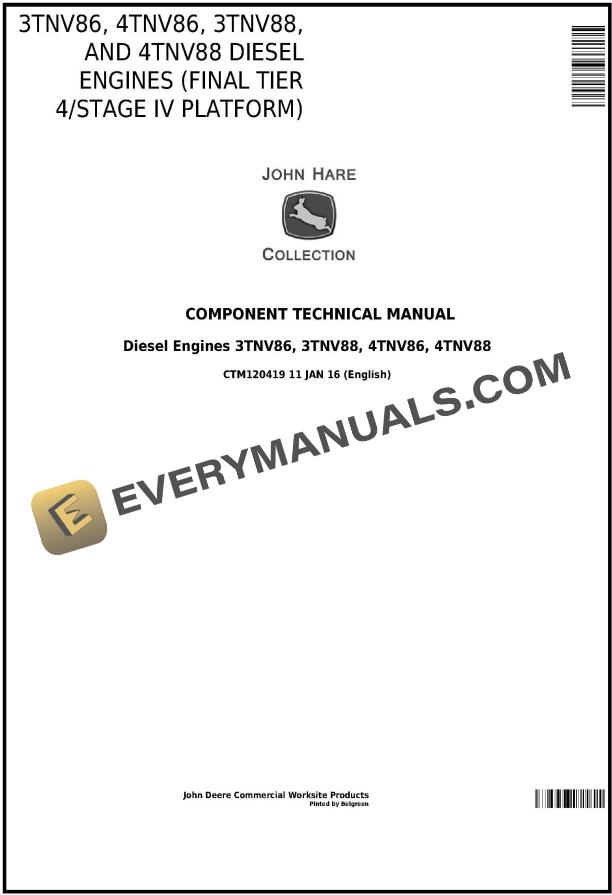 John Deere 3TNV86 4TNV86 3TNV88 4TNV88 Final Tier 4 Stage IV Yanmar Diesel Engine Component Technica