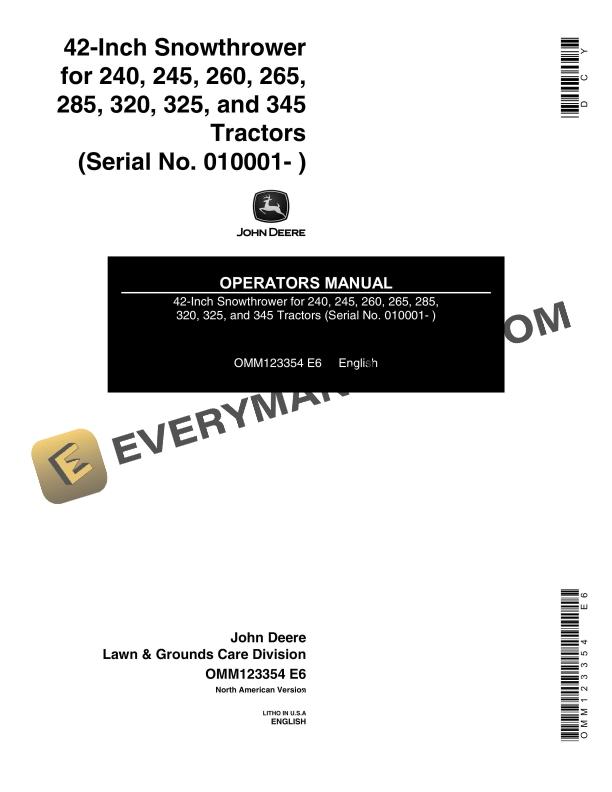 John Deere 42-Inch Snowthrower for 240, 245, 260, 265, 285, 320, 325, and 345 Tractor Operator Manua