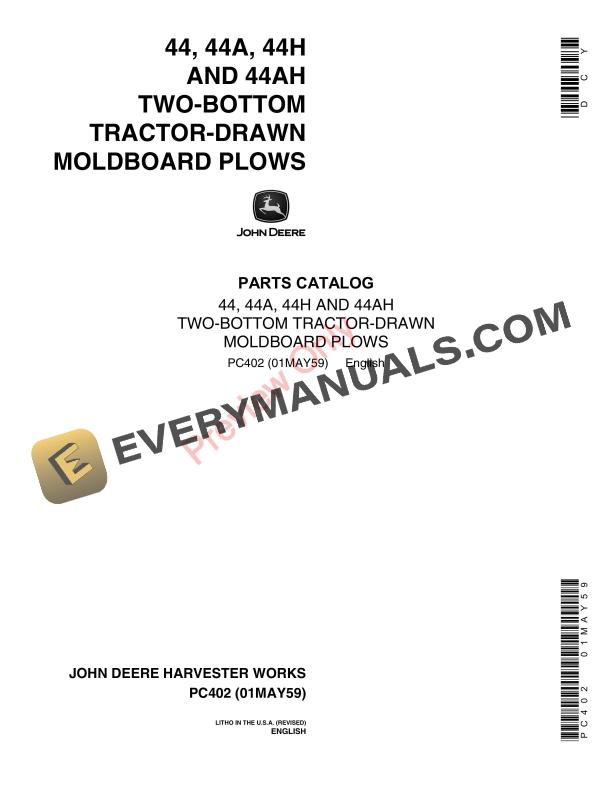 John Deere 44, 44A, 44H, 44AH Two-Bottom Tractor-Drawn Moldboard Plows Parts Catalog PC402 01MAY59
