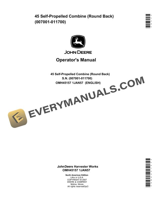 John Deere 45 Self-Propelled Combine Operator Manual OMH45157
