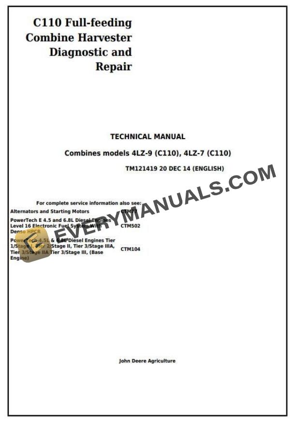 John Deere 4LZ-7 4LZ-9 C110 Combine Technical Manual TM121419