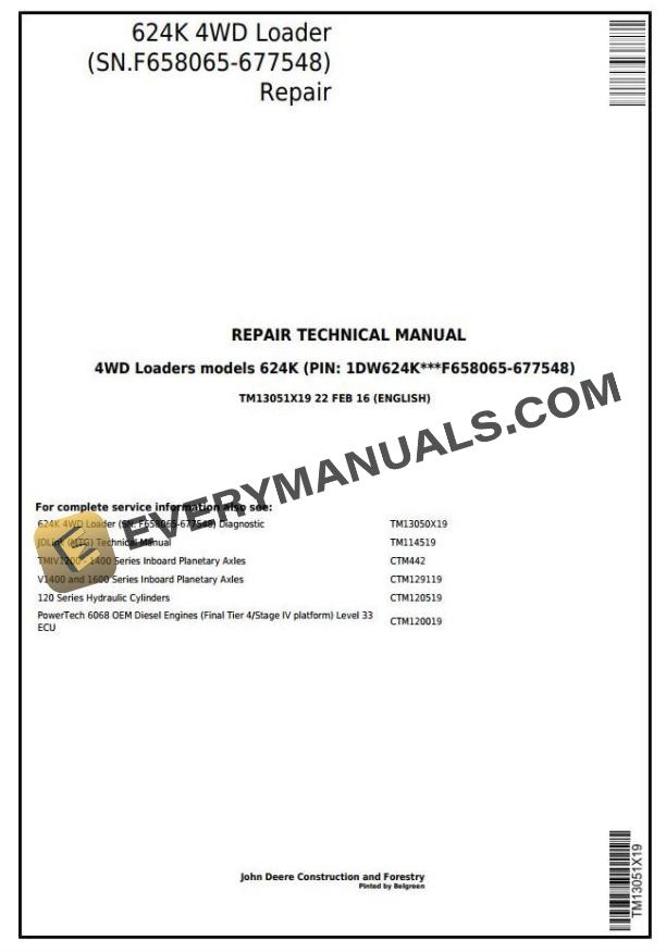 John Deere 4WD Loader 624K Repair Technical Manual TM13051X19