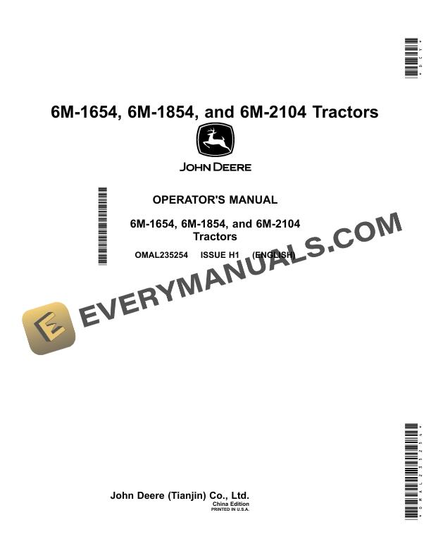 John Deere 6m-1654, 6m-1854, And 6m-2104 Tractors Operator Manuals OMAL235254