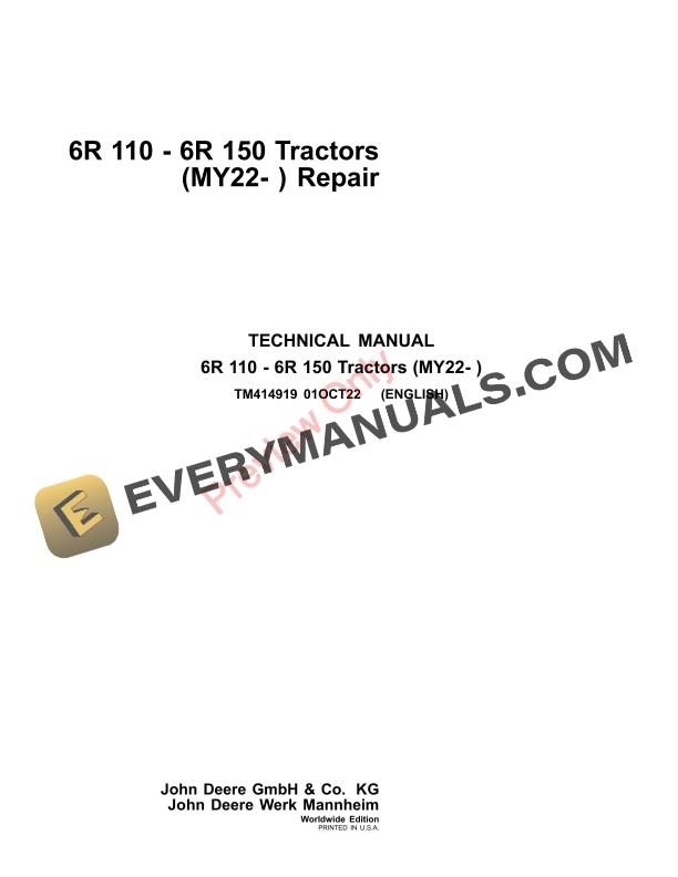 John Deere 6R 110 - 6R 150 Tractors (MY22- ) Technical Manual TM414919 01MAR23
