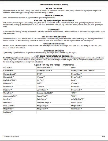 John Deere 359T - Baler Parts Catalogue Manual (PC3250)