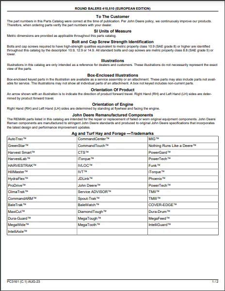 Explore our comprehensive parts catalog for John Deere 410 and 510 Round Balers - PC3161. Find all the components you need for your equipment.