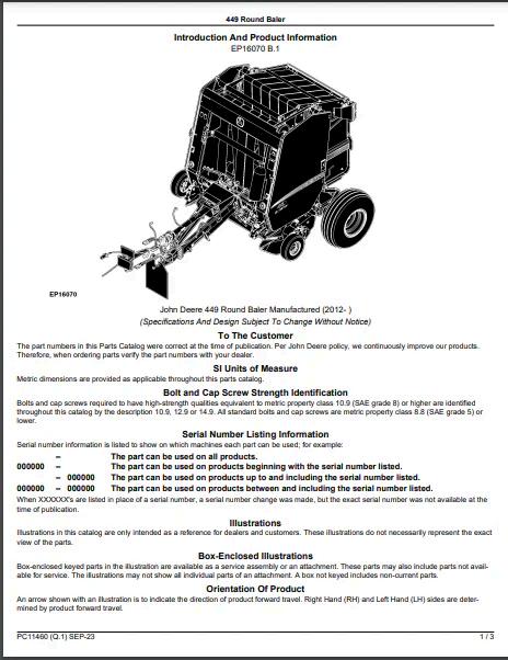 Explore the comprehensive John Deere 449 Baler Round Parts Catalogue Manual (PC11460) on our website. Find all the information you need in one place.
