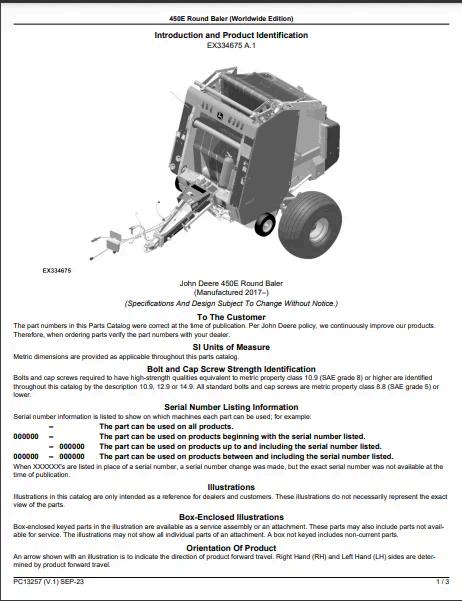 Discover a comprehensive parts catalogue manual for the John Deere 450E Baler Round. Find all the essential components you need in one place.