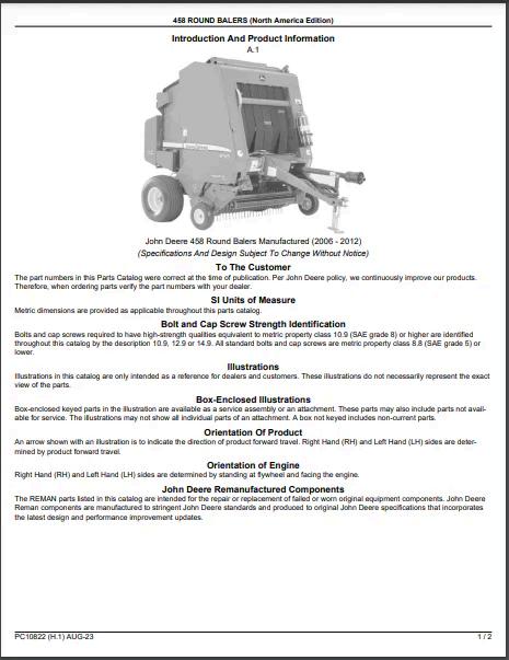 Explore the comprehensive John Deere 458 Baler Round Parts Catalogue Manual (PC10822) on our website. Find all the parts you need in one convenient place.