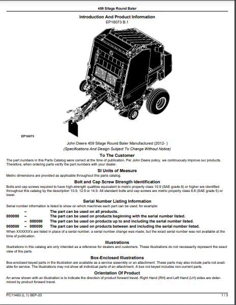 Explore our comprehensive parts catalogue manual for the John Deere 459SS Baler Round. Find all the essential components you need for your equipment.